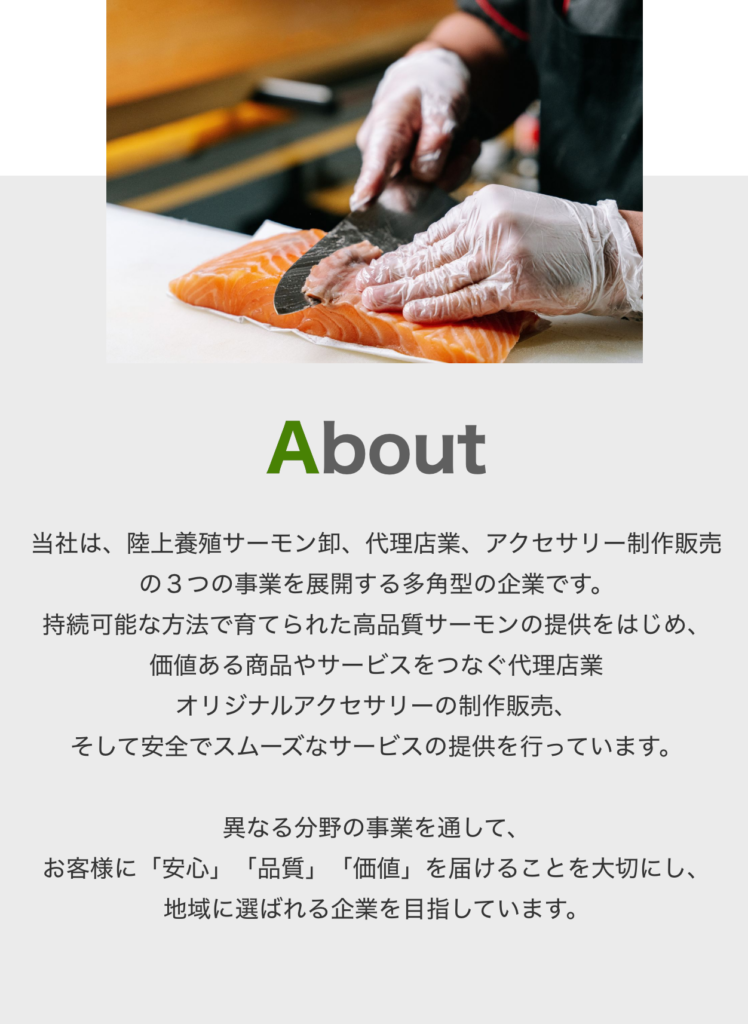 TOP 必要なものを、必要な形で 幅広い事業で価値を届ける 必要なものを、必要な形で 幅広い事業で価値を届ける About 当社は、陸上養殖サーモン卸、代理店業、アクセサリー制作販売の3つの事業を展開する多角型の企業です。持続可能な方法で育てられた高品質サーモンの提供をはじめ価値ある商品やサービスをつなぐ代理店業オリジナルアクセサリーの制作販売そして安全でスムーズなサービスの提供を行っています。異なる分野の事業を通してお客様に「安心」「品質」「価値」を届けることを大切にし地域に選ばれる企業を目指しています。 Services